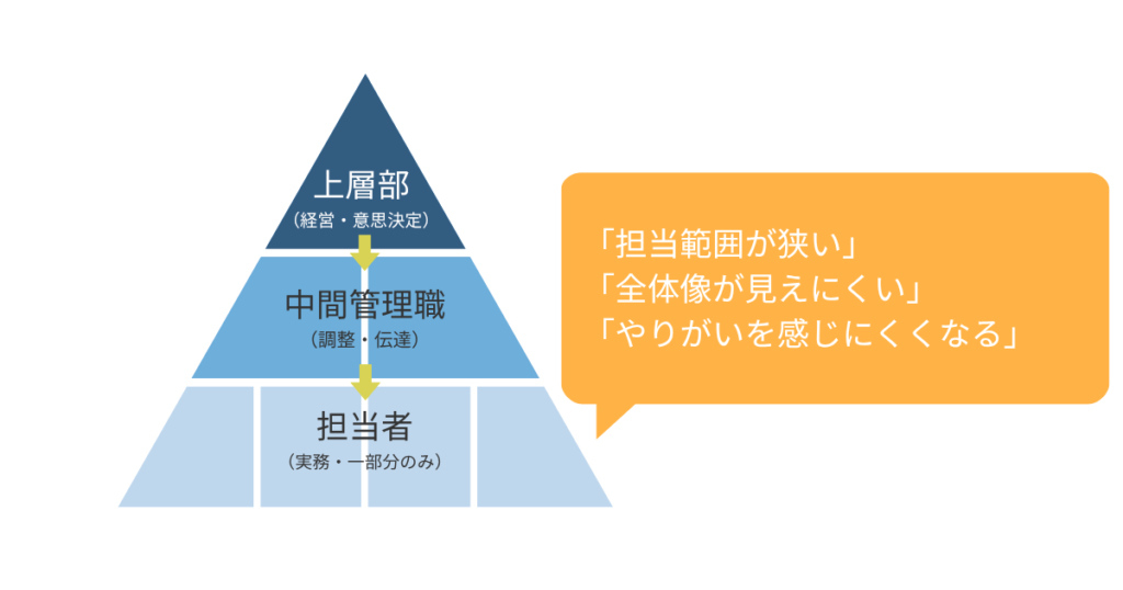- 担当業務が再分化され、仕事の全体像が見えにくい