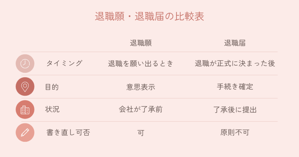 退職の意志を伝えて、会社の承認をお願いする書類です。退職願は承認前であれば撤回ができます。