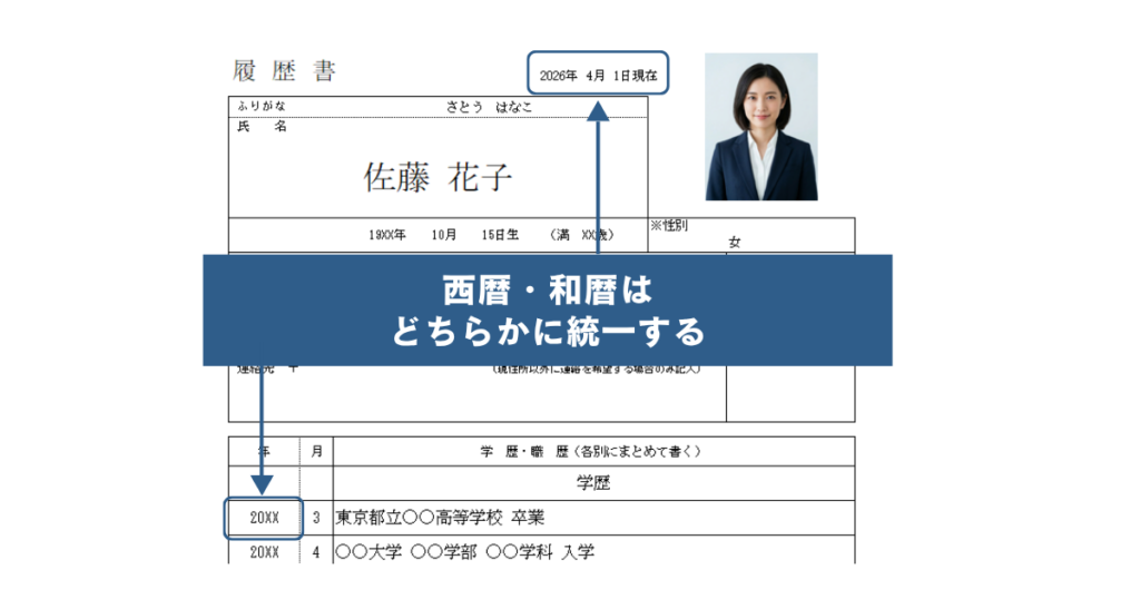 たとえば、日付欄に「2026年」と西暦で記入したにもかかわらず、学歴欄や資格欄に「令和8年」と和暦で記入していると、統一感がなくなります。採用担当者に「細部への注意が足りない」といったネガティブな印象を与えかねないため、必ず全ての日付を同じ表記に揃えましょう。