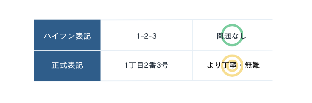 郵便番号はハイフンあり、住所の番地はハイフンなしの正式表記、と使い分けることを覚えておきましょう。