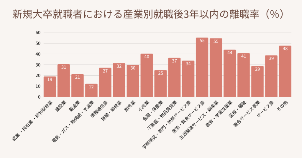 業界によっても早期離職の傾向は大きく異なります。同じ3年以内の離職でも、業界の特性や職場環境によって背景が変わってくるのです。